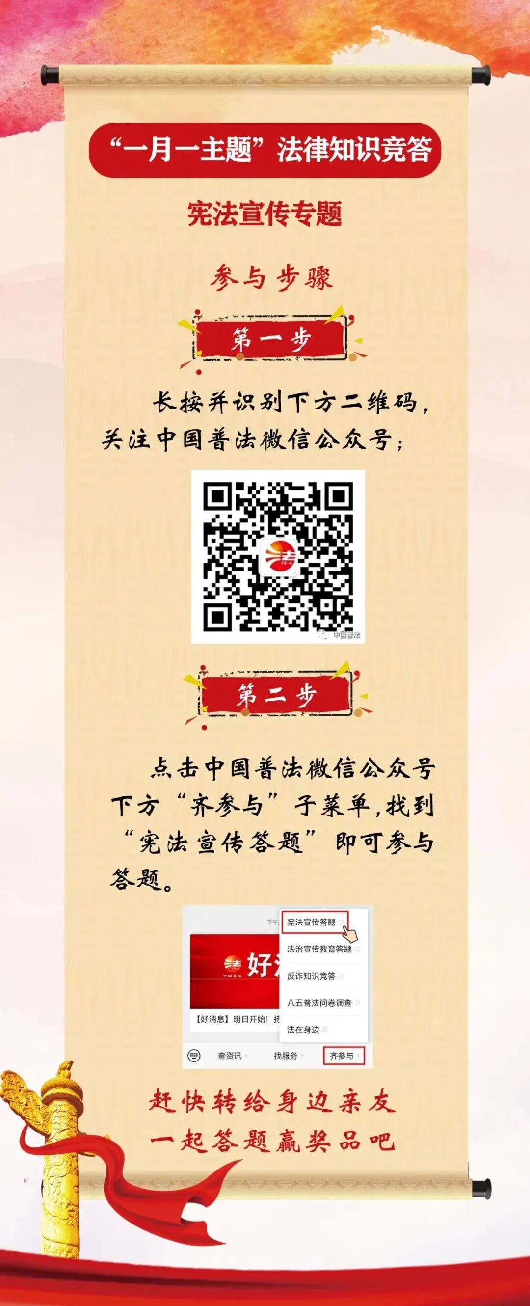 中国普法微信公众号于2025年12月1日至30日,组织开展“一月一主题”法律知识竞答・宪法宣传专题活动,欢迎大家积极参与!